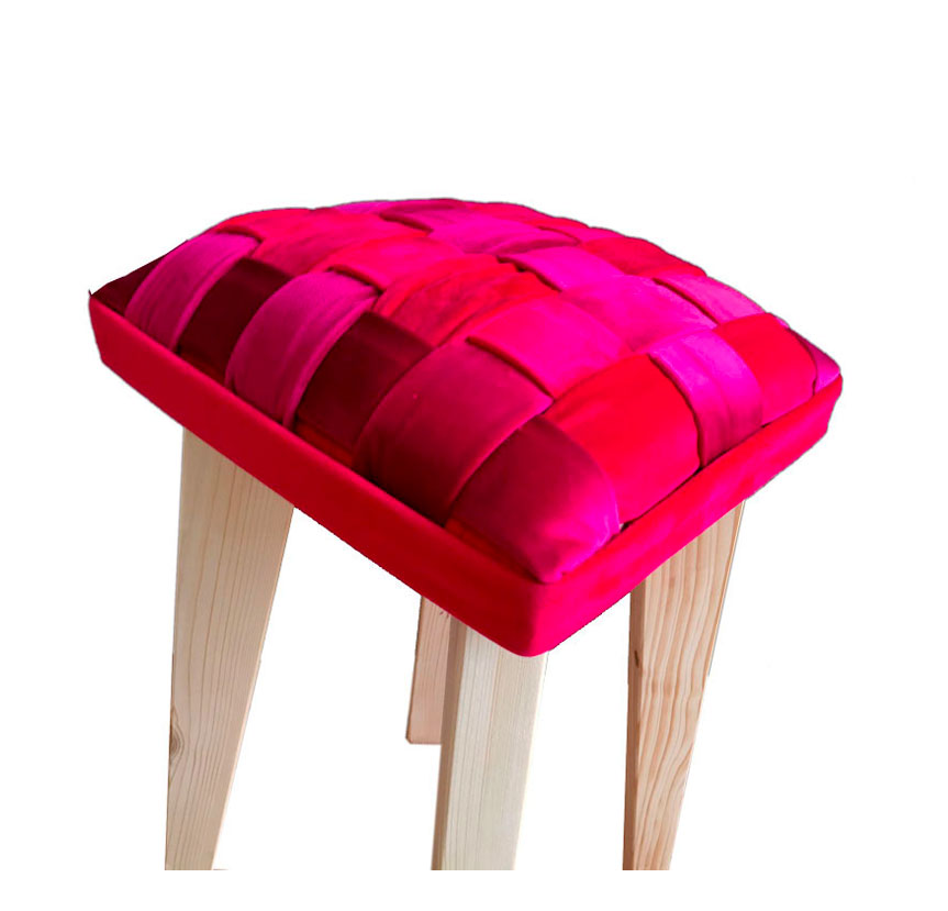 Sgabello in legno di abete certificato PEFC, con seduta in velluto intrecciato, costruito con eccedenza da lavorazioni industriali.